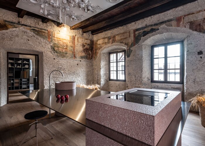A tak na konci septembra, v pôsobivom prostredí Castel Belasi vo Val di Non, rodina Cova otvorila svoje dvere zákazníkom, zamestnancom a priateľom, aby predstavila renovačné práce, ktoré prebehli v posledných dvoch rokoch a konečne odhalila dlho očakávanú kuchyňu, ktorá sa nie náhodou nachádza v historickej miestnosti s freskami umiestnené na konci expozičného itinerára o histórii firmy.