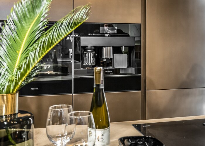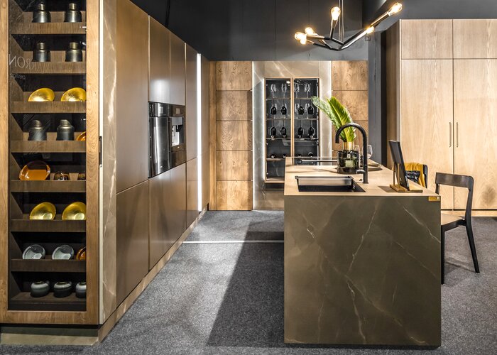 Čarovná je aj hra s podkladom. Na zadnej stene boli spracované MDF dosky. Bronzový efekt sa tu vyskytuje na ploche rovnomerne, a vďaka tomu vyzerá stena pokojne a vznešene. Pre kuchynský blok si pán Halupczok vybral živý, mramorovo štruktúrovaný povrch, ktorého všetky strany sa bronzovo lesknú a tým dodáva masívnemu bloku ľahkosť. Že má metalická povrchová úprava okúzľujúci účinok aj na pravom dreve, ukazujú bočné skrinky: tu bol kartáčovaný dub úplne odliaty do bronzu, ktorý spája najkrajšie vlastnosti dreva a kovu do niečoho nového, veľkolepého, ale úplne prirodzeného. Keď je už nový model navrhnutý dizajnérkou Annou Dzierżanowskou nainštalovaný u súkromného zákazníka, vyrába sa ďalších päť objednávok. Nápad s kuchyňou ako šperk sa stal skutočnosťou: vynikajúci, elegantný, efektívny, ale nadčasový!