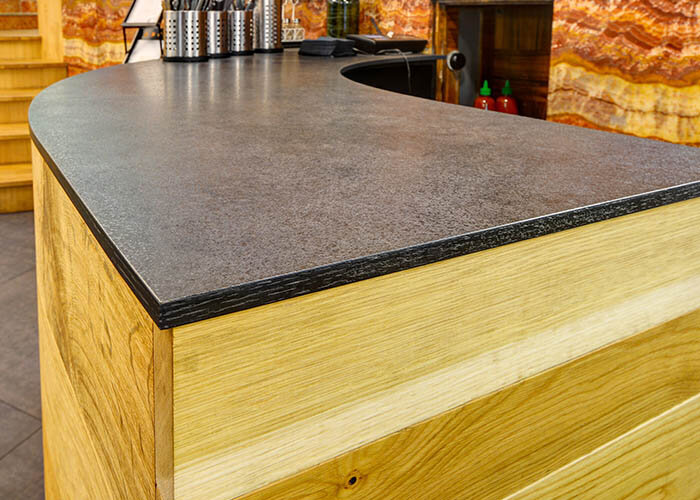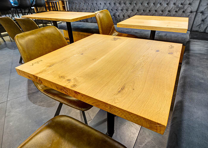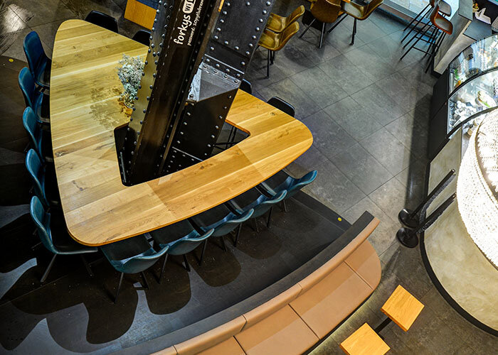 Vysoké a nízke, malé a veľké, hranaté a okrúhle – všetky varianty dubových stolov Acer Woodway nájdete v priestrannej dvojposchodovej reštaurácii. Centrálnu formáciu tvorí dlhý trojuholníkový vysoký stôl, ktorý má kapacitu 15 osôb. Z jeho stredu vyčnieva stĺp, ktorý vedie na druhé poschodie reštaurácie. Pokladničný pult a rôzne stenové prvky sú tiež z dubu, čiastočne dyhované, čiastočne masívne. Drevo dodal JAF Holz. Tam, kde je vidieť dub, bol lakovaný ADLER PUR Antiscratch matný a je tak perfektne vybavený na dlhé roky a mnohých návštevníkov reštaurácie. Jednotlivé detaily, ktoré nepodliehajú takému opotrebeniu, sú povrchovo upravené tvrdým voskovým olejom ADLER Legno-Hartwachsöl. Čierne prvky sú upravené s ADLER Neosol alebo prelakované ADLER Pigmopur. Kombinácia čierneho a dubového dreva vytvára príjemnú atmosféru: modernú, mladistvú, blízko k prírode – presne ako hostia, ktorí si vo Forky's vyzdvihnú kúsok regeneračného zdravia.