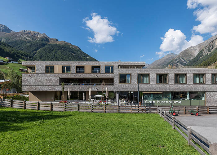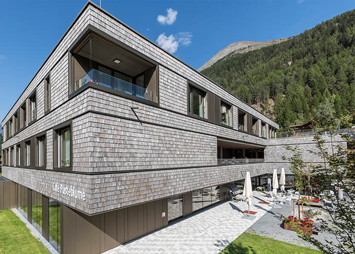 Fasáda je stelesnením „dôstojného starnutia“: pokrytá tradičnými tirolskými smrekovými šindľami, pretože po stáročia obdivovali úctyhodné farmy, rovnako ako malé stodoly, a iste priviezli mnoho krásnych spomienok obyvateľov. Samozrejme, že šindle nielen prirodzene v starobe šednú, ale sú „strieborné“ - ale nerovnomerne v závislosti od počasia a slnečného žiarenia.