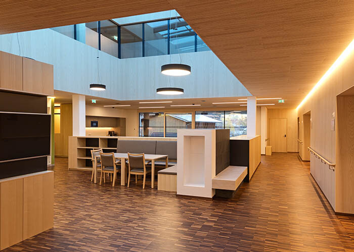 Dôstojné starnutie, nielen starnúť. To je myšlienka, ktorú firma DIN A4 Architektur nevytesala do kameňa, ale postavila z dreva. Rozloženie do rôznych potrieb obyvateľov - starostlivosti alebo pomoci - sa odráža v budove: Existujú dve mierne rozložité budovy, ktoré sú umiestnené centrálne na pozemku v centre mesta. "Vzhľadom na gradáciu svahu reagujeme na blízkosť existujúceho domu starých ľudí, výškovou diferenciáciou vzniká ranná slnečná terasa na streche. Zvlášť dôležité pre nás boli zóny chránené pred vetrom a poveternostnými vplyvmi, ktoré vás pozývajú na odpočinok vonku," hovorí projektový manažér Christian Fuchs. Veľkorysé átriá vytvárajú priateľské priestory pre rekreáciu a pohyb, ktoré sú miestami interakcie a komunikácie obyvateľov.