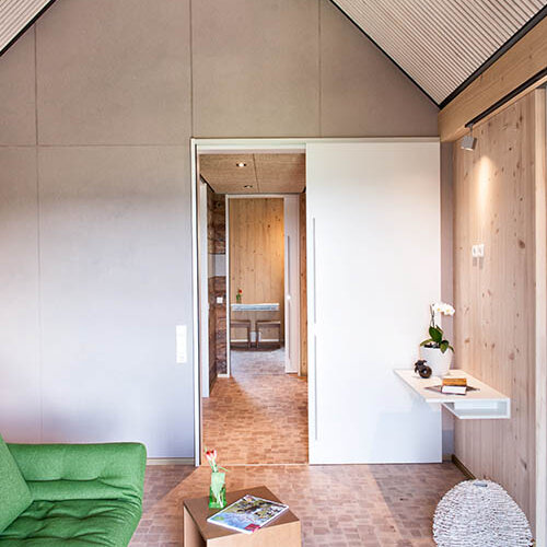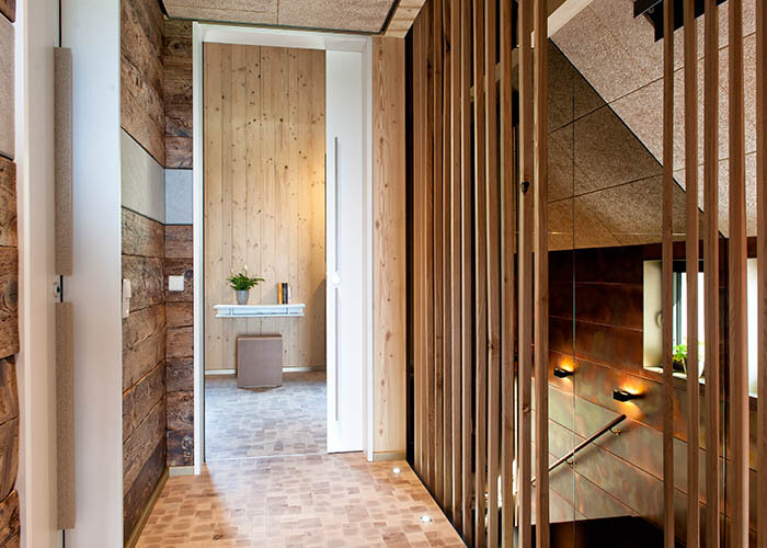 Drevo, kam sa pozriete: na obkladoch fasád, ktorým dáva efekt glazúry ADLER Lignovit Platinum elegantný, šedohnedý lesk; na podlahe - naolejovaný buk; na vnútorných stenách douglaska, biela jedľa a borovica prímorská, ktoré chráni ADLER Lignovit Interior UV100 pred zožltnutím. Drevo možno nájsť aj na miestach, kde by ste ho hneď na prvý pohľad nečakali: police z drevených panelov vstavané v stene vyzerajú ako normálny kov - ale v skutočnosti sú upravené s ADLER Brilliant-Metallic, ktorý im dodávajú vzhľad pravého zlata. Televízny panel pôsobí opačným efektom, ako keby bol potiahnutý kožou - účinok, ktorý Boschert dosiahol produktom ADLER-Reißlack. A steny v kuchyni a v spálňach sa zdajú byť síce betónové, ale v skutočnosti sú vytvorené s ADLER Betoneffekt. Boschert prirodzene použil drevo aj v kuchyni - na skrinky a jedálenský stôl.