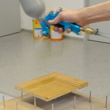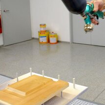 Opracovávaný kus namorte rovnomerne striekaním moridlom ADLER ADLER Aqua Positiv-Plus. ADLER-technik Klaus Moser tu použije odtieň Fichte gekocht.