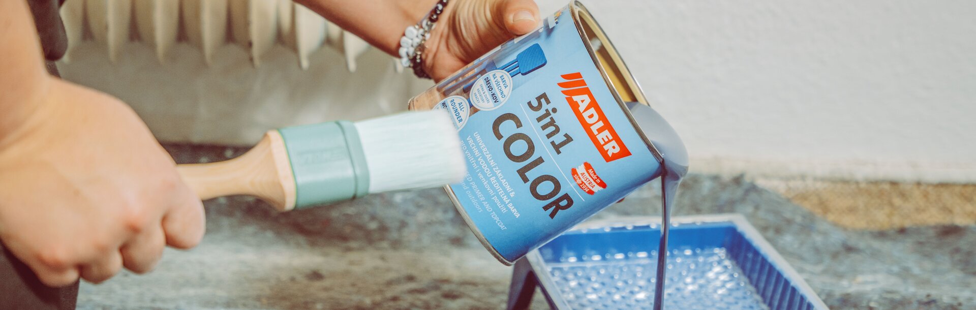 Následne aplikujte druhú vrstvu farby ADLER 5in1-COLOR. Na väčšie rovné plochy aplikujte farbu valčekom. Prelisy, rúrky a iné malé plochy pretrite štetcom. Druhú vrstvu nechajte zaschnúť približne 6 hodín.