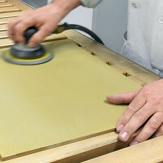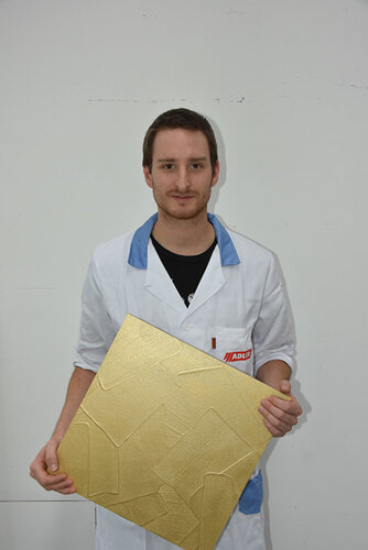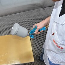 Lak Pigmopur musí teraz vyschnúť pri izbovej teplote počas najmenej troch hodín, najdlhšie cez noc. Potom nasleduje povrchová úprava s ADLER Brilliant-Metallic. Za týmto účelom nastriekajte povrch opatrený základným náterom bez medzibrúsenie s Brilliant-Metallic v odtieni Gold. Dbajte na rovnomerný a tenký nástrek z oboch strán.
