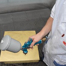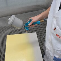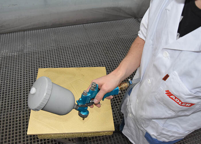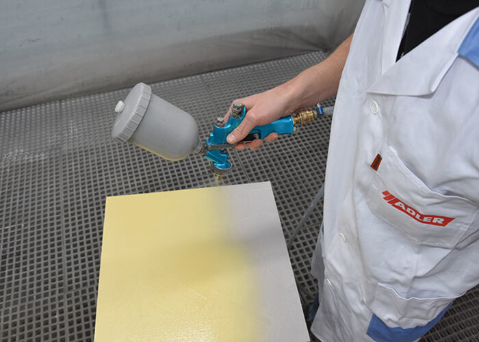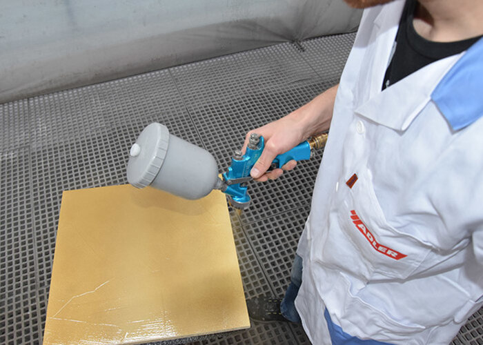 Teraz sa aplikuje striekaním ADLER Pigmopur G50 vo farebnom odtieni Gold (zlato). Týmto krokom dosiahneme optimálne prekrytie.