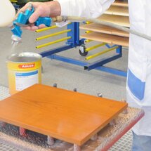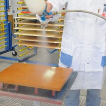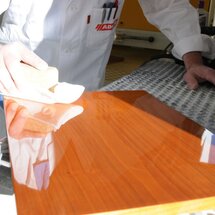 Klaus Moser tu nanesie dve vrstvy PUR-Glanzlack. Prvú vrstvu treba nechať schnúť asi tri hodiny, potom naniesť druhú vrstvu. Bez medzibrúsenia! Kým sa môže povrch leštiť, musí sa dodržať doba schnutia minimálne tri dni.