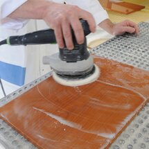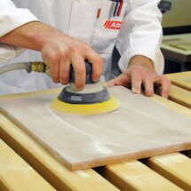 Každá plniaca vrstva sa pred ďalším nánosom musí prebrúsiť. Obvykle sa v praxi používa excentrická brúska (ale pozor: neprebrúsiť!), zrnitosť je pritom stále jemnejšia: od 320 pre prvú vrstvu až po 500 pre tú tretiu. „Nesmú zostať žiadne lesklé miesta, to by neskôr bolo vidno," hovorí Klaus Moser. Posledné brúsenie sa odporúča urobiť ručne pozdĺž vlákien, pretože od excentrickej brúsky by mohli ostať kruhové ryhy.