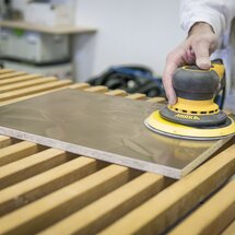 Teraz je dôležité brúsenie: Na dosiahnutie intenzívneho kovového efektu a pre autentický lesk sa musí brúsenie vykonávať so zvyšujúcim sa zrnom. Čím vyššie je čislo zrna posledného brúsenia, tým silnejší je kovový efekt. Odporúčame nasledujúce úrovne: 180 - 240 - 360 - 600 - 1000 - 1500 - 3000. Potom sa brúsny prach opatrne odstráni špeciálnym riedidlom ADLER Spezial-Verdünnung. Ako vrchný náter sa nanáša ADLER Tiropur NG v lesku G70 alebo G100.