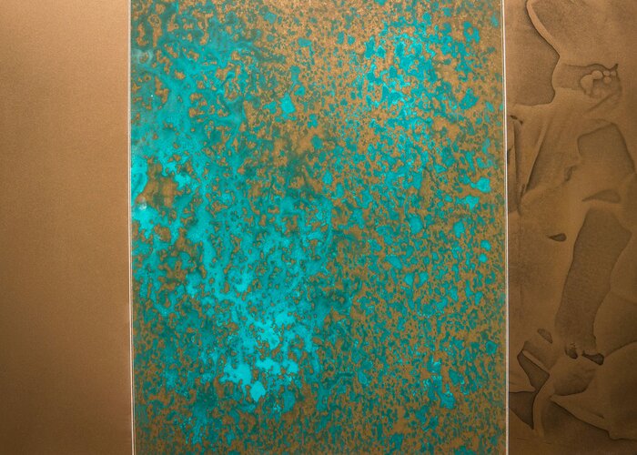 Kovový povrch sa začne meniť už po niekoľkých minútach. Po vysušení cez noc je modrozelená patina úplne výrazná. Z dôvodu ochrany povrchu a súčasne zachovania drsného charakteru patiny je potrebné lakovať tromi nátermi PUR-Antiscratch HQ v lesku G10.