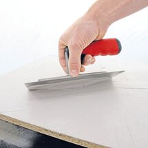Teraz môžete siahnuť po nádobe s farbou. V tomto prípade sme zvolili ADLER Betoneffekt vo farebnom odtieni Daiquiri. Murárskou lyžicou z ušľachtilej ocele naneste podklad do podoby omietky. Nepravidelne krížom krážom - tak vznikne charakteristická štruktúra, ktorá realisticky vyzdvihne efekt betónu. Či vytvoríte zrnité drážky alebo jemné prechody, to všetko ponecháme na vás. Rovnako môžete zmiešať rôzne farebné odtiene spôsobom „mokré na mokré", aby ste dosiahli obzvlášť verný efekt na povrchu. Toto majstrovské dielo by malo schnúť počas noci.