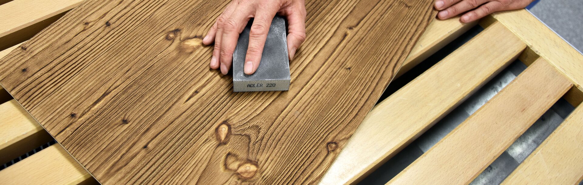 Pre základný náter môžete využiť vodouriediteľné a rovnako aj rozpúšťadlové laky. Po uplynutí doby schnutia 6 hod. (pre vodouriediteľné laky) a 12 hodín (rozpúšťadlové laky) alebo najlepšie cez noc, môžete naniesť prvú vrstvu krycieho laku. Stefan Oberladstätter odporúča použiť ako krycí lak matný PUR lak ADLER Pur-Naturmatt alebo ADLER PUR-Antiscratch HQ G5. Na dosiahnutie svetlejších farebných odtieňov by ste mali zvoliť niektorý svetlostály krycí lak, ako napr. ADLER Legnopur alebo ADLER Aqua-Resist , aby ste zafixovali výsledný odtieň nalakovaného dreva.