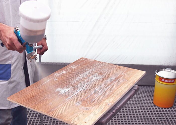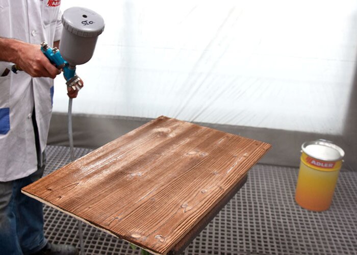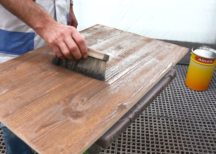 Pre základný náter môžete využiť vodouriediteľné a rovnako aj rozpúšťadlové laky. Po uplynutí doby schnutia 6 hod. (pre vodouriediteľné laky) a 12 hodín (rozpúšťadlové laky) alebo najlepšie cez noc, môžete naniesť prvú vrstvu krycieho laku. Stefan Oberladstätter odporúča použiť ako krycí lak matný PUR lak ADLER Pur-Naturmatt alebo ADLER PUR-Antiscratch HQ G5. Na dosiahnutie svetlejších farebných odtieňov by ste mali zvoliť niektorý svetlostály krycí lak, ako napr. ADLER Legnopur alebo ADLER Aqua-Resist , aby ste zafixovali výsledný odtieň nalakovaného dreva.