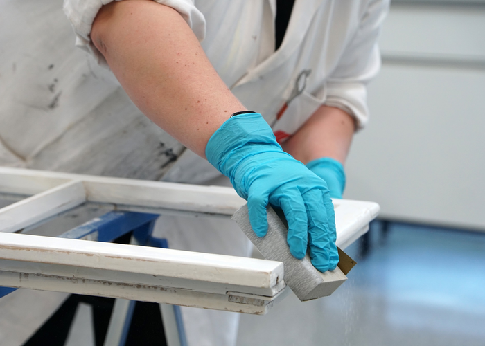 Okenné krídlo a rám zbrúste zrnitosťou P100 - P150 (ihličnaté dreviny) alebo P150 - P180 (listnaté dreviny) a dôkladne odstráňte brúsny prach.