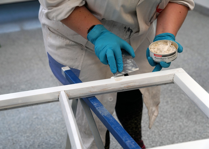 Otvorené škáry a iné poškodenia povrchu je možné opraviť pomocou ADLER Kunstharz-Spachtel. Nechajte tmel zaschnúť 16 hodín, potom vybrúste do hladka zrnitosťou P120.