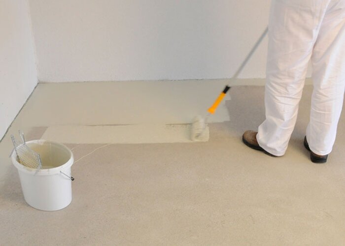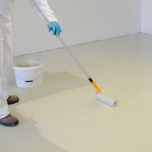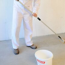 Teraz môžete použiť valček s krátkym vlasom, ten sa hodí na prácu na veľkých plochách betónovej podlahy. Na rohy je vhodný štetec. Pracujte vždy v pruhoch a dbajte na to, aby sa jednotlivé úseky rovnomerne prekrývali, aby ste dosiahli jednotný výsledok.