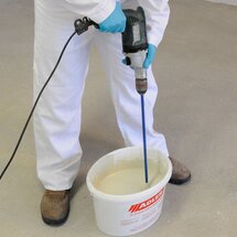 Na zabezpečenie trvanlivosti epoxidového náteru podlahy v garáži, pivnici alebo dielni je dôležité obe zložky náterovej hmoty riadne premiešať. Dôkladne premiešajte epoxidový náter 2K-Epoxi-Beschichtung s epoxidovým tužidlom 2K-Epoxi-Beschichtung Härter v pomere 2:1 pomocou miešadla alebo miešacieho drievka.