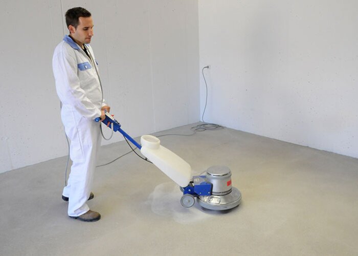 Vrchnú uvoľnenú vrstvu podlahy prebrúste podlahovou brúskou so zrnitosťou 16. Potom podlahu dôkladne vysajte, aby na podklade nezostali žiadne nečistoty a prach.