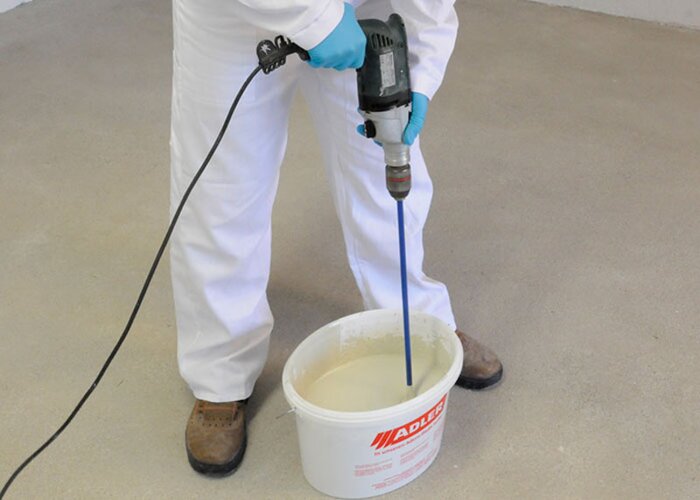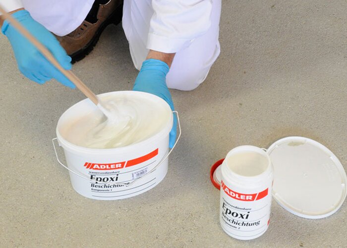 Epoxidový náter ADLER 2K-Epoxi-Beschichtung je vhodným produktom na uzavretie povrchu betónových podláh. Aby ste dosiahli optimálne výsledky, aplikujte epoxidový podlahový náter pomocou valčeka s krátkym vlasom. Okrem toho odporúčame na rohy a hrany použiť štetec, napríklad Aquamaxx Plus.Ako správne namiešať epoxidovú živicu a tužidlo a ako dlho s ňou môžem pracovať?
