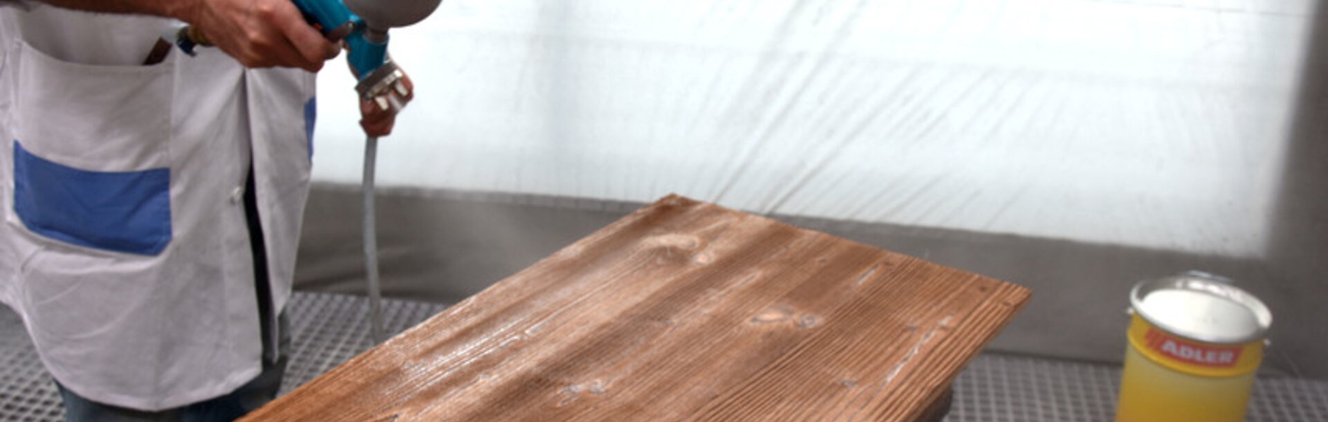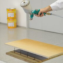 Pri nanášaní moridla je potrebné dbať aj na zamýšľané nanášané množstvo: Ak sa nanesie príliš málo materiálu, môže dôjsť k nepeknému vytváraniu oblakov – najmä pri egalizujúcich moridlách – ale príliš veľké nanášané množstvo ovplyvňuje aj vzhľad moridla. Odporúča sa pracovať s malými veľkosťami trysiek a nízkym tlakom a pred morením striekaciu pištoľ dôkladne vyčistiť a vysušiť. Najlepšie je nanášať moridlo mokré do mokrého v dvoch vrstvách, pričom nanášajte v silne sa prekrývajúcich pásoch. Po aplikácii by sa mal povrch na svetle rovnomerne mokro lesknúť, ale na dreve by nemala byť žiadna tekutina. Osobitnú pozornosť treba venovať prvému a poslednému pásu, ako aj okrajom – tu sa bežne nanáša rôzne množstvo materiálu. Moridlo sa musí následne pred nanesením vrchného laku nechať dôkladne zaschnúť, inak môže dôjsť k zafarbeniu, najmä pri moridlách na vodnej báze. Mimochodom: Ak je svetlé drevo namorené na bielo, odporúča sa natónovať aj vrchný lak jemne nabielo – napr. farebným koncentrátom Solva-Tint od ADLER – pre rovnomerný vzhľad bez žltnutia.