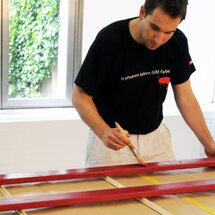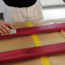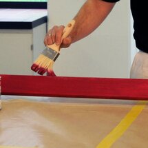 ... a pomocou štetca na vodné laky ním súvislo natrite jednotlivé dosky. Aby sa predišlo stekancom a tvorbe kvapiek, treba dosky natierať vo vodorovnej polohe. Dosky nechajte schnúť 5 - 6 hodín, a potom natrite aj zadnú stranu.