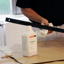 Pre dôkladné očistenie prebrúste ešte pomocou brúsneho rúna a odmastite produktom ADLER Entfetter pomocou handričky. Po 5 - 10 min. pôsobenia môžete povrchy umyť čistou vodou a všetko nechať uschnúť.