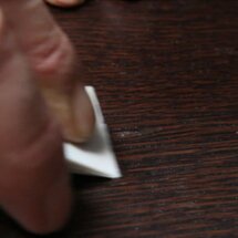 Prebytok odstráňte hoblíkom na vosk alebo škrabkou na lak. Aby ste opravované miesto odmastili, prebrúste ho opatrne brúsnym rúnom. Brúsny prach odstráňte bavlnenou handričkou.