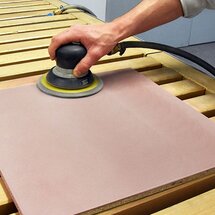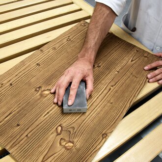 Teraz je na rade brúsenie. Na prípravu povrchu na patinovaný efekt sa brúsenie vykonáva v štyroch stupňoch: P180, P240, P360 a P600. Potom musí byť brúsny prach opatrne odstránený pomocou ADLER Spezial-Verdünnung.