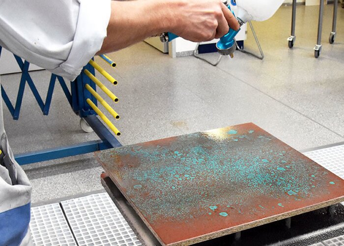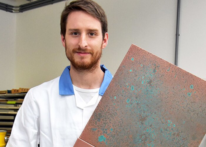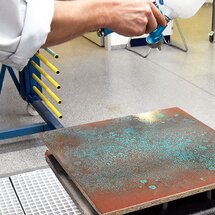 Kovový povrch sa začne transformovať sám po niekoľkých minútach. Modrozelená patina sa kompletne vykreslí cez noc po zaschnutí povrchu. Aby bol povrch chránený a zároveň zachovaný drsný charakter patiny, musí byť teraz prelakovaný troma vrstvami PUR-Antiscratch s úrovňou lesku G10.