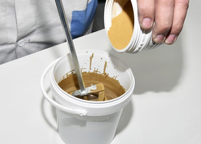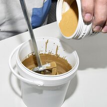 Perfektná zmes pre tekutý kov: 100 hmotnostných dielov Aqua-Pure-Metal, 5 hmotnostných dielov Aqua-PUR-Härter a 250 hmotnostných dielov Aquafix Kupfer opatrne zmiešajte až dôjde k odstráneniu hrudiek - najlepšie zariadením s košíkovým miešadlom.