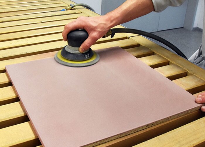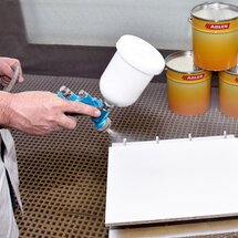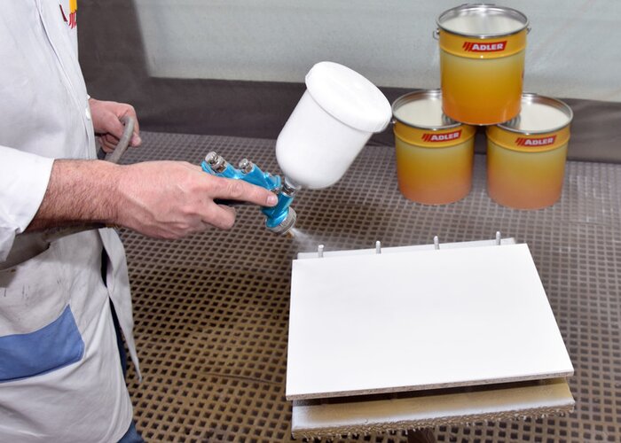 Ideálnym podkladom pre ADLER povrchové úpravy so skutočným kovom sú vyplnené drevotrieskové alebo MDF dosky. Po jednom nástreku PUR-Ecofill Weiß (biely) sa suchý povrch bezprostredne pred lakovaním jedenkrát prebrúsi zrnitosťou P240.