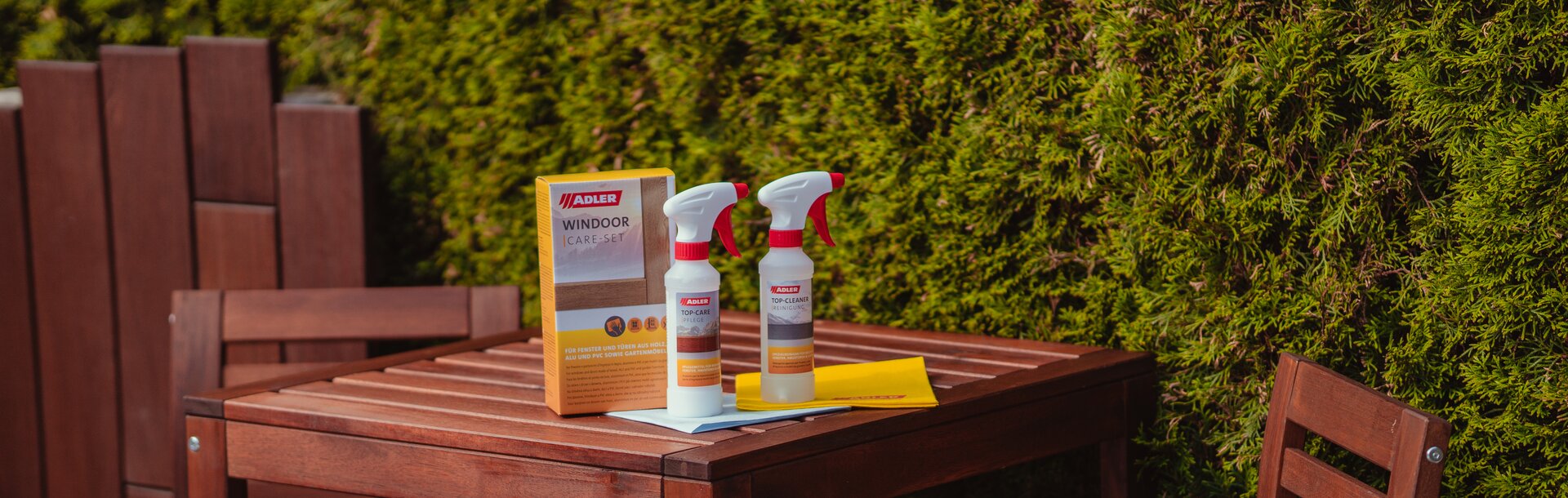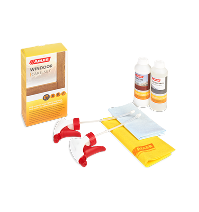 Vďaka novej sade WinDoor Care-Set od spoločnosti ADLER môžete oživiť okná, dvere, ako aj záhradný nábytok s lazúrovacou alebo krycou povrchovou úpravou, aj s rôznymi stupňami matu/lesku. Aj na matných povrchoch dosahuje WinDoor Care-Set perfektné výsledky a zachováva ich matný vzhľad. Aplikácia jeden- až dvakrát ročne predlžuje životnosť povrchovej úpravy. Vďaka aktívnym čistiacim a ošetrovacím látkam odpudzuje vodu, olej a nečistoty a uzatvára mikrotrhliny a póry na povrchu. Okrem toho je možné ošetrený povrch bez problémov prelakovať.